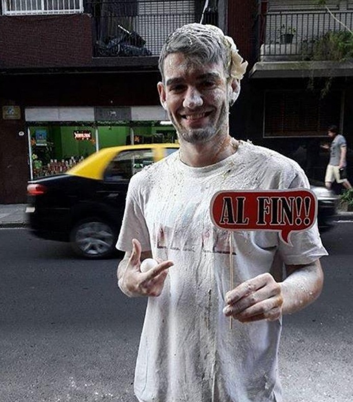 Ramiro Bueno, el hijo de Rodrigo, se recibió de periodista deportivo y sus seres queridos lo esperaron afuera de la facultad para celebrar con el clásico ritual de los huevos y la harina.