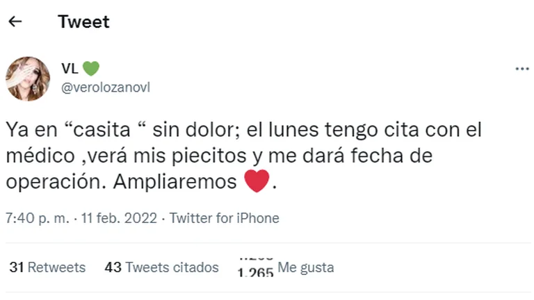 Por su parte, Vero Lozano volvió a acudir a su cuenta de Twitter para dar más información y tranquilidad. Hasta este momento, solo había escrito un mensaje poco tiempo después de haber sufrido el accidente. ”¡Estoy bien! Gracias por la preocupación y el amor”, señaló la conductora de Cortá por Lozano. Y hace unas horas, replicó el dato que brindó el periodista Lío Pecoraro: “Hablé con Vero Lozano, está muy bien, se siente bárbara y el lunes definen cuándo la operan, palabra de Vero. Especulaciones de lado, esta es la verdad”. escribió el conductor de El run run del espectáculo.