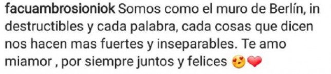 "Somos como el Muro de Berlín, in destructibles", rezaba el mensaje original que envió Facundo Ambrosioni a su novia, Morena Rial.