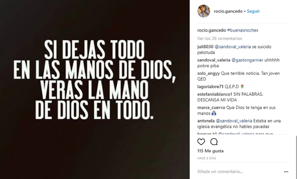 La modelo, que estaba hundida en una profunda depresión, había publicado un llamativo mensaje en las redes sociales hace cinco días. “Si dejás todo en las manos de Dios, verás la mano de Dios en todo”, reza la frase que Gancedo compartió el pasado viernes 24 de noviembre.