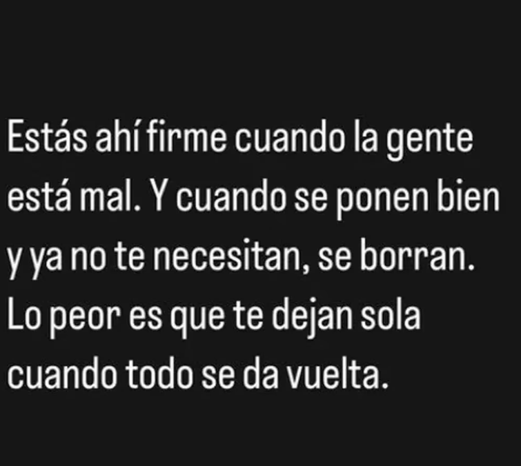 Ahora, luego de todo lo ya escrito por ella, y de hasta borrar la fotografía de perfil en su cuenta de Instagram, la intérprete explicó la tarde de este domingo que “estás ahí firme cuando la gente está mal. Y cuando se ponen bien y ya no te necesitan, se borran”. Además, para dejar en claro lo que está viviendo, cerró con “lo peor es que te dejan sola cuando todo se da vuelta”.