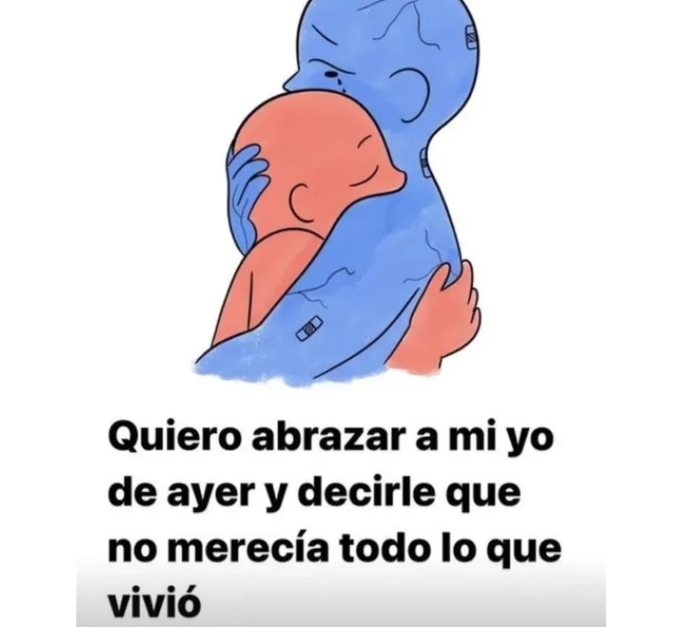 Seguido de ese escrito, sumó otro en que se ve la figura de dos personas abrazadas y el texto que reza “Quiero abrazar a mi yo de ayer y decirle que no merecía todo lo que vivió”, para explicar a sus seguidores que no fue todo color de rosa y todo lo que debió vivir en distintas etapas.