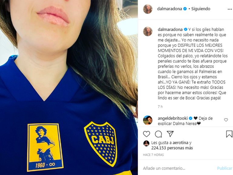 “Y si los giles hablan es porque no saben realmente lo que me dejaste… Yo no necesito nada porque yo DISFRUTÉ LOS MEJORES MOMENTOS DE MI VIDA CON VOS! Colgados del palco, yo relatándote los penales cuando te ibas afuera porque preferías no verlos, los abrazos cuando le ganamos al Palmeiras en Brasil… Cierro los ojos y estamos ahí… ¡YO YA GANÉ! ¡Te extraño TODOS LOS DÍAS! ¡No necesito más! ¡Gracias por hacerme amar estos colores! ¡Qué lindo es ser de Boca! ¡Gracias papá!”, señaló en la red social.