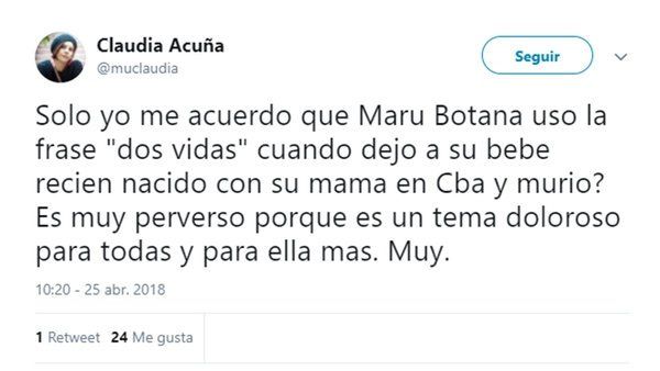 “¿Sólo yo me acuerdo que Maru Botana usó la frase “dos vidas” cuando dejó a su bebé recién nacido con su mamá en Buenos Aires y murió? Es muy perverso porque es un tema muy doloroso para todas y para ella más. Muy”, escribió en Twitter Acuña, quien luego le pidió disculpas y borró el mensaje.