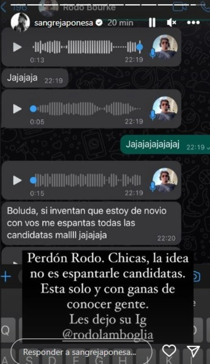 Receptiva del pícaro mensaje, la China le respondió: "Perdón, Rodo. Chicas, la idea no es espantarle candidatas. Está solo y con ganas de conocer gente. Les dejo su Instagram".