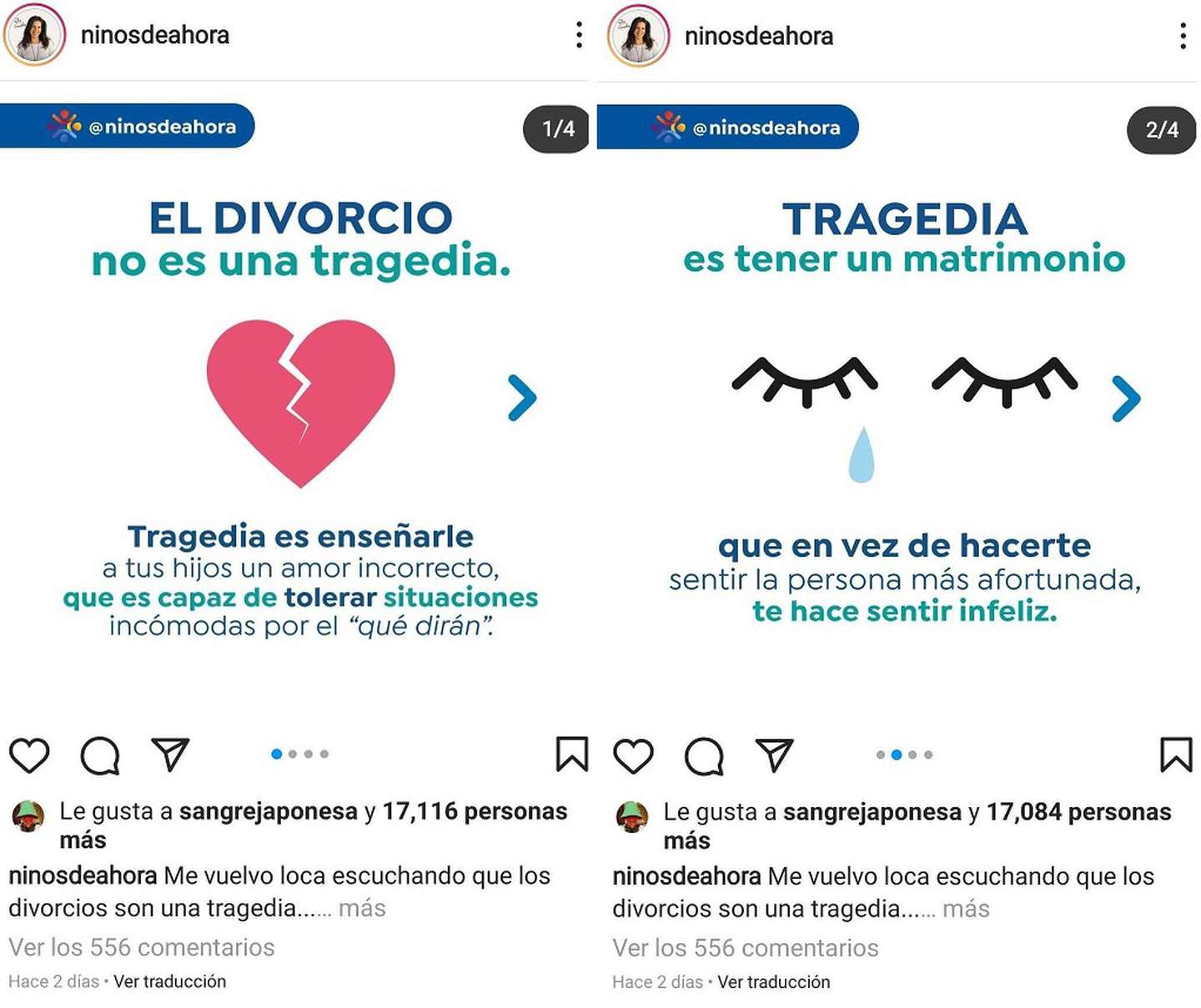 “El divorcio no es una tragedia. Tragedia es enseñarles a tus hijos un amor incorrecto, que es capaz de tolerar situaciones incómodas por el ‘qué dirán’. Tragedia es tener un matrimonio que en vez de hacerte sentir la persona más afortunada te hace sentir infeliz”, se lee en una de las imágenes.