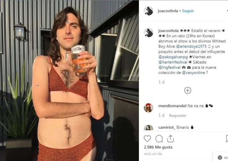 "Estalló el verano", publicó el joven junto a una imagen suya en bikini, mientras toma un vaso de cerveza.