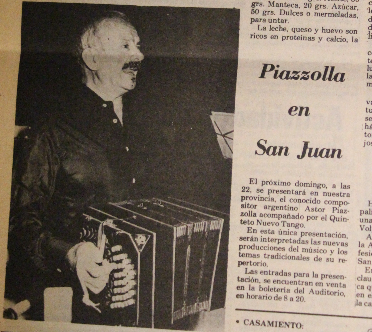 San Juan se caracteriza por tener un espacio musical por excelencia y ese es el Auditorio Juan Victoria. En cincuenta años albergó a grandes figuras consagradas tanto nacionales e internacionales. Del firmamento de estrellas que pasaron por la sala, Astor Piazzolla fue una de ellas. Hubo dos oportunidades recordadas por muchos seguidores y registradas por DIARIO DE CUYO que el creador de "Adiós Nonino" y "Libertango" hiciera gala de su talento. El primer encuentro fue un martes 15 de agosto de 1972, en lo que fue la denominada "Semana del Sol", por aquel entonces, la provincia celebraba la primera edición de la Fiesta Nacional del Sol. Astor ofreció su concierto en compañía de "Conjunto 9" y el poeta Horacio Ferrer. La segunda oportunidad fue en agosto también pero en 1982, y cayó un domingo, pero aquella vez fue en la época dorada de su Quinteto Nuevo Tango. De estas dos presentaciones, sólo se conserva una grabación analógica y fue realizada por el técnico de sonido del Auditorio, Roque Olivares. A sus 72 años de edad, el especialista y encargado de realizar esta tarea técnica -que habitualmente hacía para los conciertos de la Orquesta Sinfónica de la UNSJ- recordó aquel invierno de 1982, en una comunicación con este medio. "Siempre fui un admirador fiel a la música de Piazzolla. Cuando vino a tocar, no era nada desconocido para mí. Al enterarme de esto, tuve la intención de conocerlo y pedirle autorización para grabar su concierto. Como tenía fama de quisquilloso y de mal carácter que no quería tener contacto con la gente, fui con esa impresión y me llevé una gran sorpresa. Porque cuando hablé con él fue todo lo contrario, muy amable conmigo y no tuvo problema en grabarle. Eso sí, me pidió que después del concierto le enviara la grabación a su domicilio y así cumplí", relató Roque que fue uno de los primeros operarios técnicos para la construcción de Radio Nacional San Juan, Radio Universidad y el Creacom.