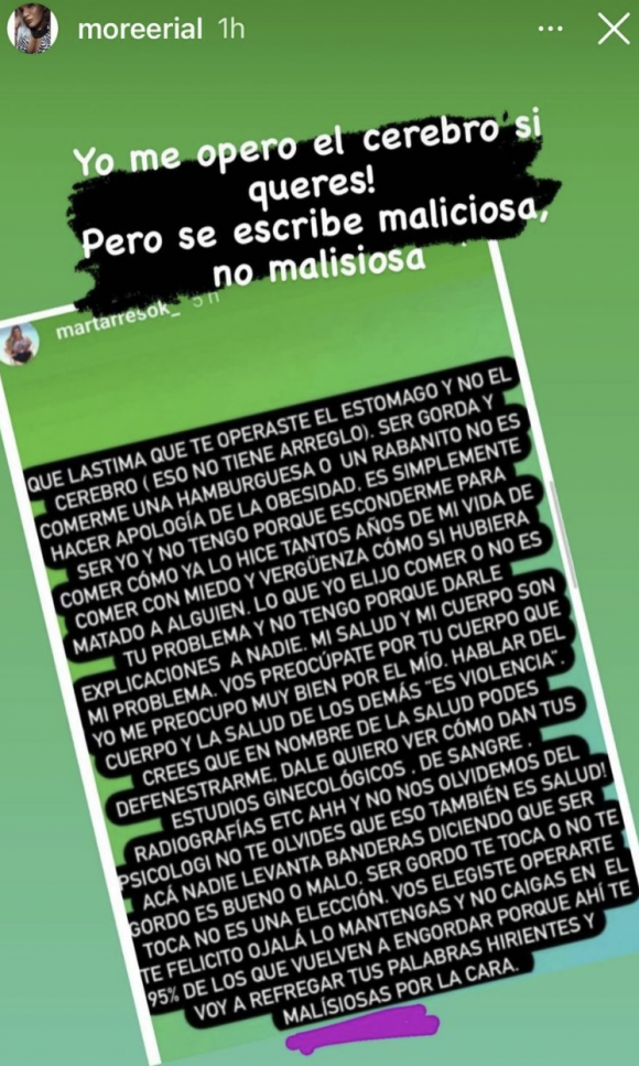 “Qué lástima que te operaste el estómago y no el cerebro, eso no tiene arreglo. Ser gorda y comerme una hamburguesa o un rabanito no es hacer apología de la obesidad. Es simplemente ser yo y no tengo que esconderme para comer como ya lo hice tantos años”, le dijo Mar a través de sus stories de Instagram, enojada por las declaraciones de More que la había fulminado por, según ella, hacer "apología" del sobrepeso.