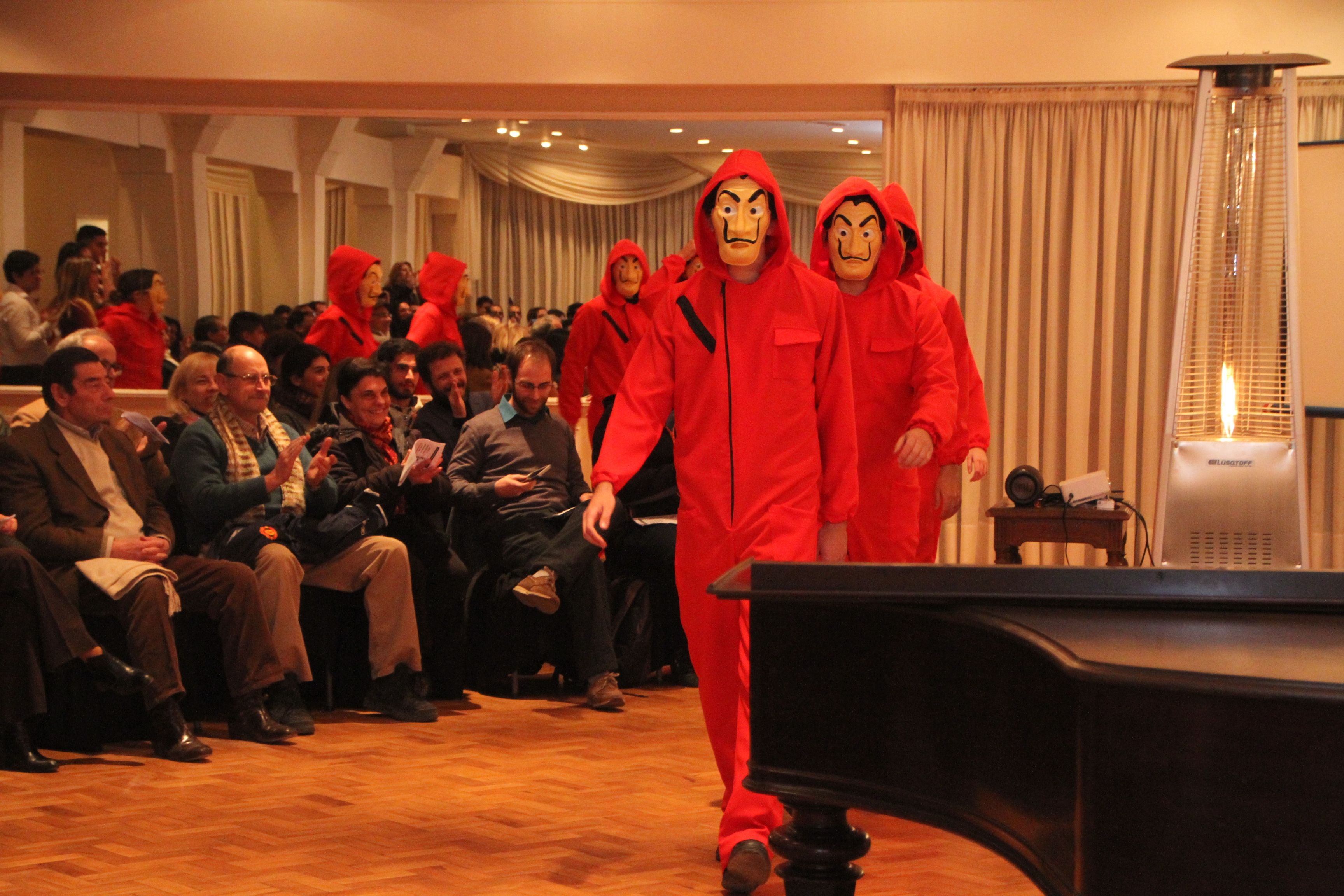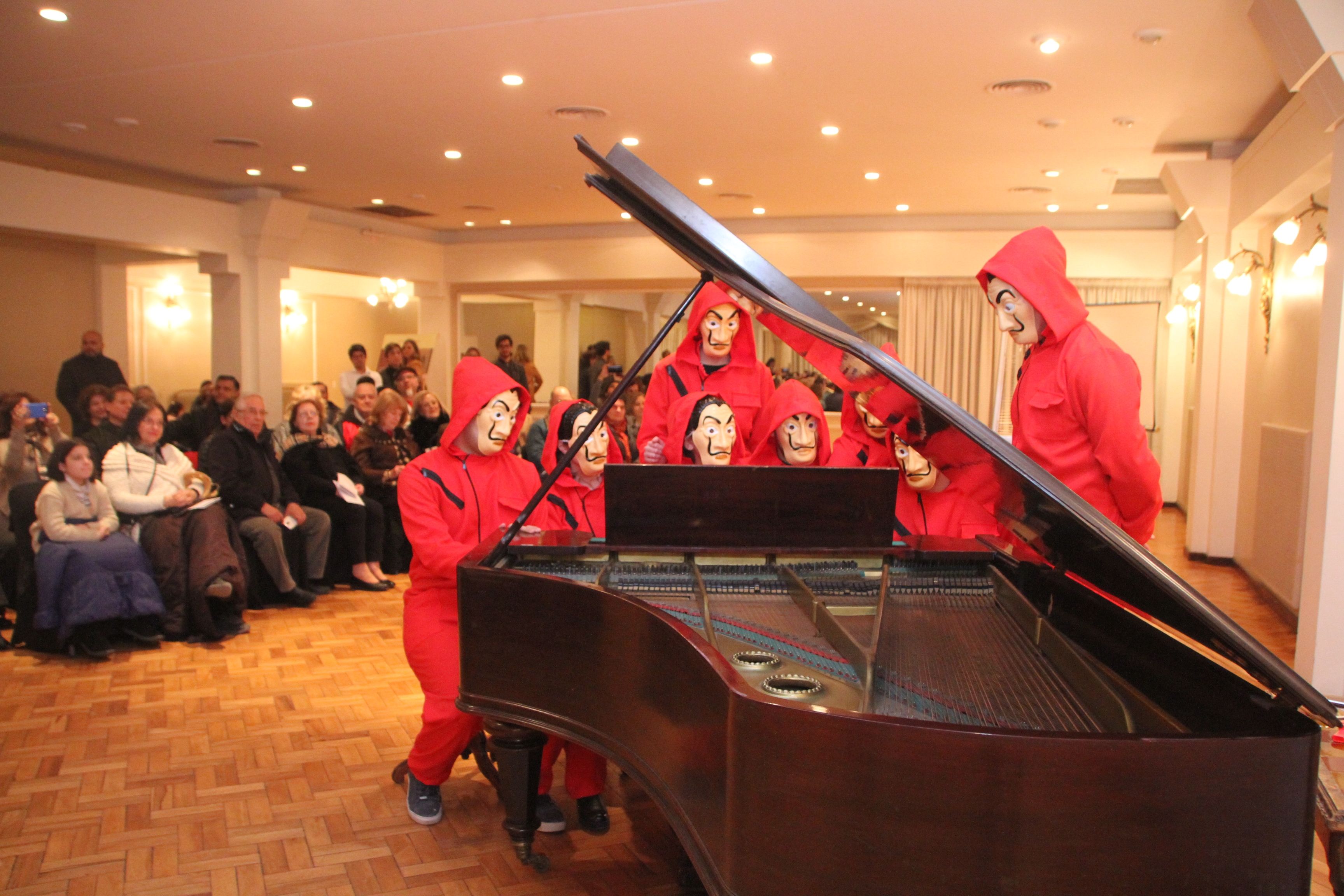 El murmullo de sorpresa fue sucedido por desconcertados aplausos. El público estaba impactado. No era para menos: atravesaban el coqueto salón del Club Social ocho personas vestidas con mamelucos rojos y máscaras de Dalí. Así de original fue la presentación de los pianistas de La Tecla Feliz, que anoche participaron del ciclo Brindis con el Arte interpretando parte de la banda de sonido de La casa de papel caracterizados como los personajes de la producción. Los ocho integrantes (Mariana Pechuan, Andrea Zanni, Mariana Garrotti, Javier Villegas, Juan Ignacio Peña, Juan Varela Graffigna y Giuliano Riccobelli) se pusieron manos a la obra con My life is going on, la canción que musicaliza la apertura de la serie española que logró convertirse en un fenómeno mundial desde su inclusión en Netflix. Le siguió su versión de Bella ciao -con arreglos de Ana Inés Aguirre ambas- que el público acompañó por momentos haciendo palmas. La letra en italiano y castellano estaba en el programa, por si querían cantarla, aunque no se animaron, pero sí algunos no pudieron evitar filmar con sus celulares mientras los jóvenes tocaban con las máscaras puestas. Al final hubo encendidos aplausos y varios "bravos". La Tecla también incluyó la apertura de la serie Juego de Tronos, entre otras piezas, siempre poniendo el toque particular del singular ensamble.