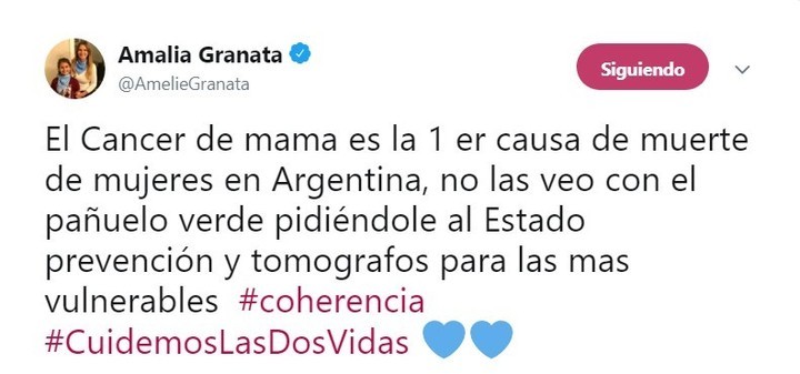 Rato después, luego de la triste noticia, la periodista Amalia Granata publicó un polémico mensaje que desató una ola de cruces en las redes sociales. “El cáncer de mama es la primera causa de muerte de mujeres en Argentina, no las veo con el pañuelo verde pidiéndole al Estado prevención y tomógrafos para las más vulnerables #coherencia #CuidemosLasDosVidas”, escribió Granata en su Twitter.