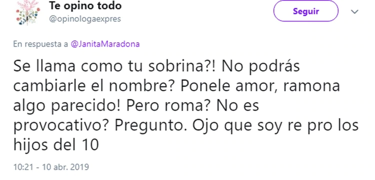 "¿Se llama como tu sobrina? No podrás cambiarle el nombre? ¡Ponele Amor, Ramona, algo parecido! ¿Pero Roma? ¿No es provocativo? Pregunto. Ojo que soy re pro los hijos del Diez", expresó uno de ellos.
