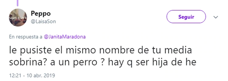 "¿Le pusiste el mismo nombre de tu media sobrina? ¿A un perro ? Hay que ser hija de…", agregó otra más.
