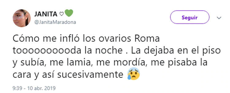 "Cómo me infló los ovarios Roma toda la noche. La dejaba en el piso y subía, me lamía, me mordía, me pisaba la cara y así sucesivamente", expresó en su cuenta de Twitter junto a un emoji de una carita triste.