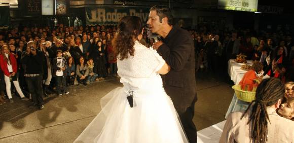 Anoche, en las puertas del Cine Teatro Municipal (frente a la Plaza 25 de Mayo), los sanjuaninos fueron testigos de la apertura del Encuentro Regional de Teatro del Nuevo Cuyo. Consistió en una sorpresiva intervención urbana denominada ‘Casorio’, la cual rompió con todos los moldes, provocando un gran revuelo en el microcentro y que complicó el tránsito de vehículos durante la tarde. La calle Mitre, entre Mendoza y Gral. Acha, estuvo cortada desde las 17.00 de ayer, ya que la organización montó un escenario con luces, sonido y elementos escenográficos. La acción comenzó a las 21, cuando los novios: Silvio Guevara y Marcela Barber (ambos actores sanjuaninos) salieron del hall del cine bajo una lluvia de arroz. La pareja realizó un cuadro costumbrista acompañado por un elenco numeroso de intérpretes locales. Cuando se acercó el saludo final y el brindis, se escuchó el grito de: ‘¡Vivan los novios! ¡Viva el teatro!’. Inmediatamente vino el jolgorio y tanto actores como espectadores bailaron la cumbia ‘La burrita’ entre otras canciones del grupo Alquimia Cuyana. En plena calle, la fiesta del teatro abrió sus puertas para todos.