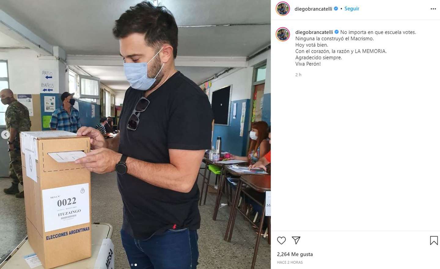“No importa en que escuela votes. Ninguna la construyó el Macrismo. Hoy votá bien. Con el corazón, la razón y la memoria. Agradecido siempre. ¡Viva Perón!”, comentó.