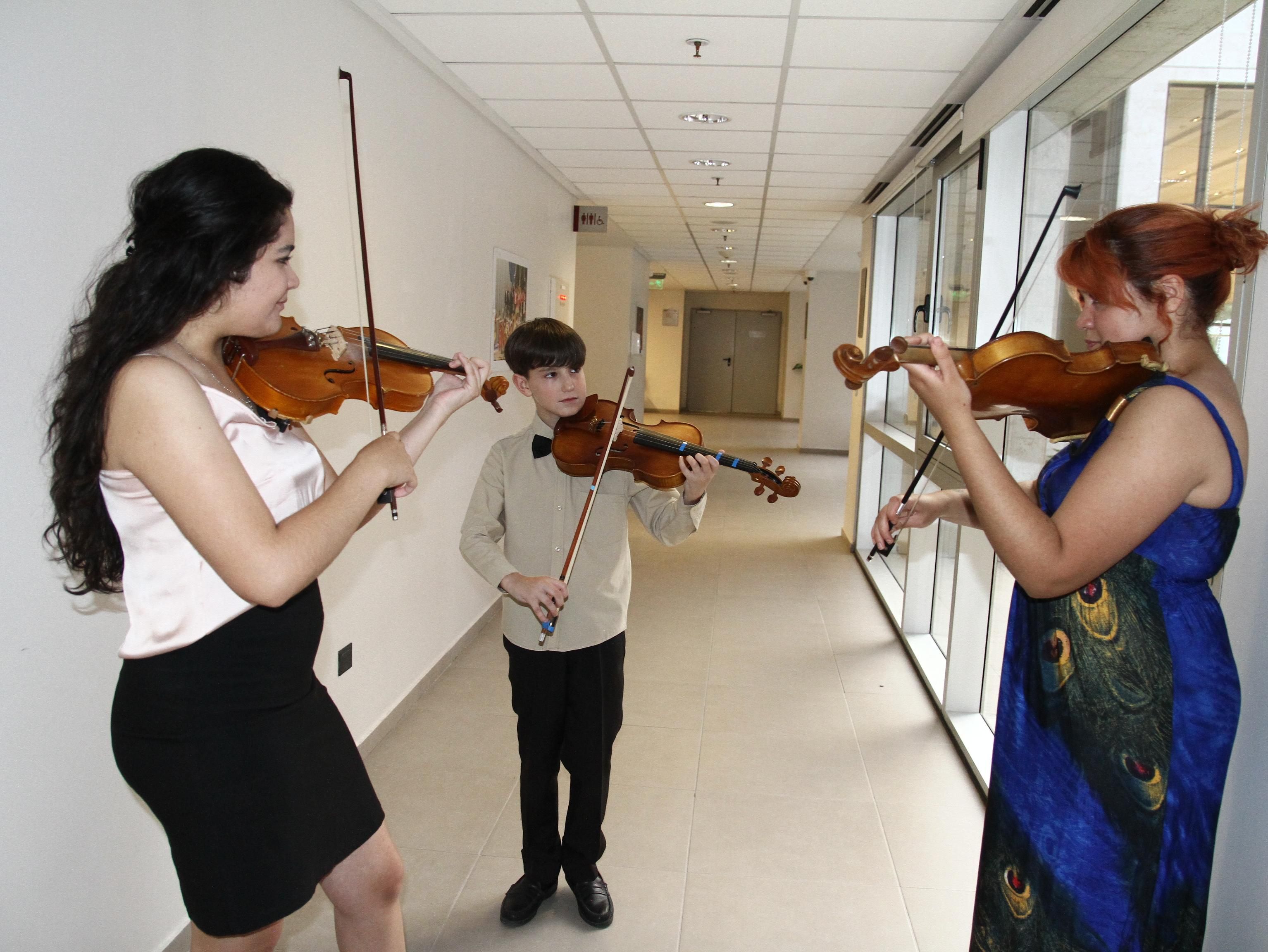 Enérgicas y sonrientes, un grupo de jóvenes violistas practicaba un segmento de su actuación y al terminar lanzaron una exclamación a coro, orgullosas. Más lejos, solo, Mateo practicaba. Está "algo nervioso’ confesó. Tiene 12, es de Sarmiento, y tiene una hinchada propia en la platea.