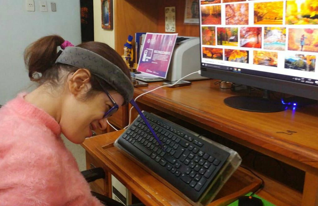 María de las Mercedes en casa junto a la compu, su “amiga’, herramienta a través de la cual estudia, se expresa y se comunica.