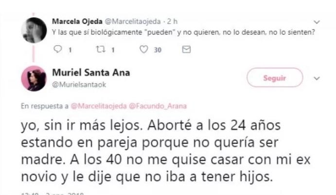 Al ver su mensaje, la periodista Marcela Ojeda se sumó al debate. “¿Y las que sí biológicamente “pueden” y no quieren, no lo desean, no lo sienten?”, cuestionó. “Yo, sin ir más lejos, aborté a los 24 años estando en pareja porque no quería ser madre. A los 40 no me quise casar con mi exnovio y le dije que no iba a tener hijos”, respondió Santa Ana.