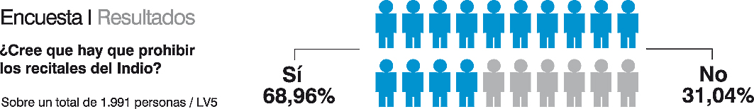 Los oyentes del programa Diario de Mediodía de LV5 se manifestaron y opinaron a través de las redes sociales si apoyaban o no que se sigan realizando los recitales del Indio Solari. Ante la consigna descrita en la gráfica: "¿Creés que hay que prohibir los recitales del Indio?", de un total de 1991 personas que participaron, casi un 69% contestó positivamente frente a un 31% por la negativa, que apoyaba al cantante.