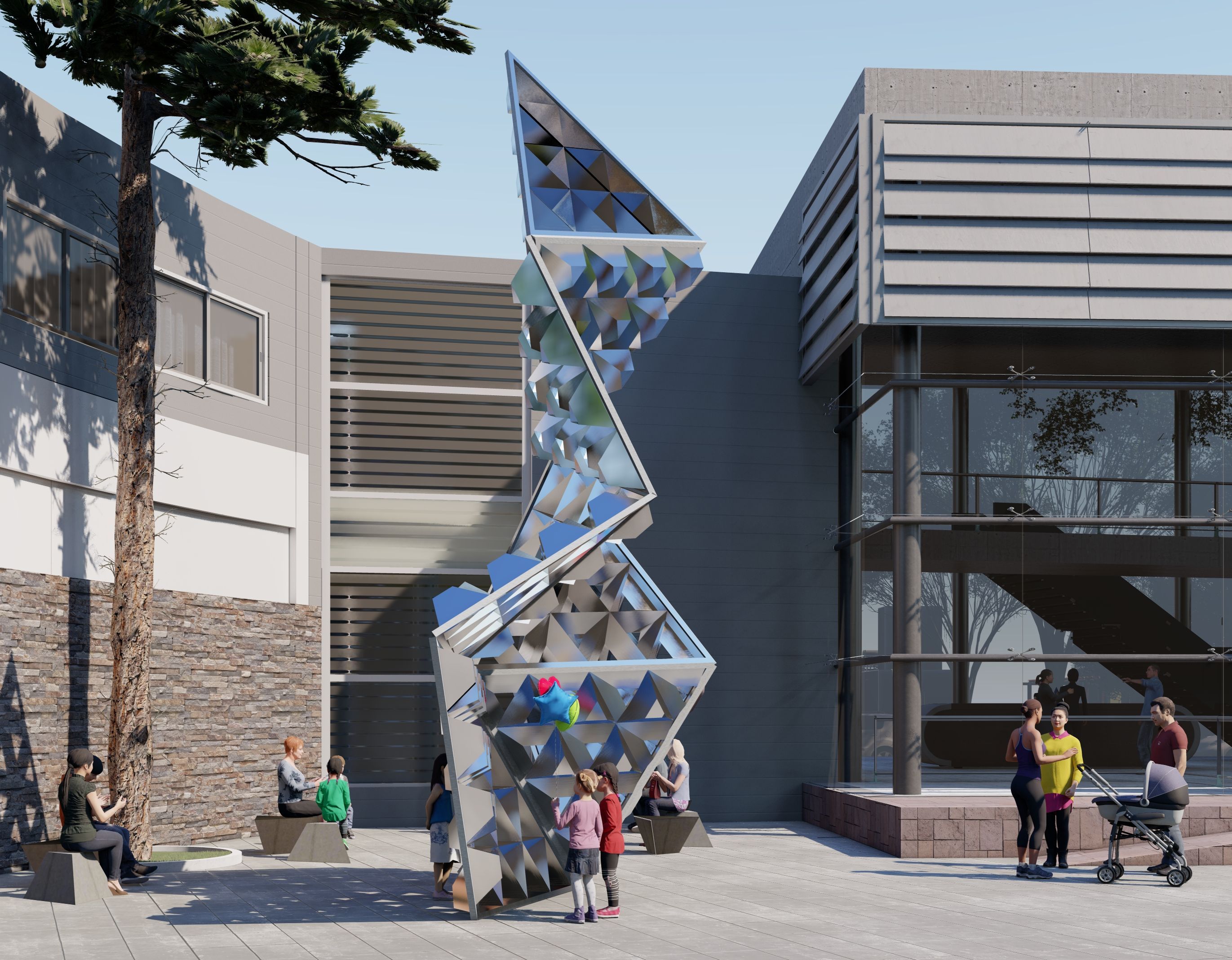 Premio Internacional de Escultura, será emplazado en el frente del Museo Franklin Rawson. ‘Pensé qué quiero que la escultura diga, en relación a ese lugar. Me surgió que el Museo es parte del tejido socio-cultural y se me vino a la mente el caleidoscopio, porque ese tejido son aportes de todos que se van modificando, entrelazando, que se yuxtaponen’, comentó García Huertas. Estará realizado en acero inoxidable espejado que refleja el entorno y que, según las condiciones de luz, proporciona un juego especular dinámico.