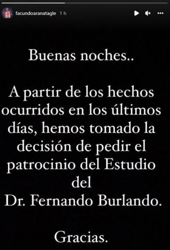 "Buenas noches. A partir de los hechos ocurridos en los últimos días, hemos tomado la decisión de pedir el patrocinio del Dr. Fernando Burlando. Gracias", escribió Facundo Arana, apenas un par de horas después de que su esposa, la modelo María Susini, liderara una feroz defensa donde aseguró que el actor "es la víctima" y que "él no es una persona violenta". Aunque aclaró que a veces puede golpear la mesa si está enojado.