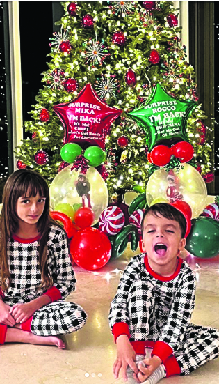 y dorado. Y en composé para la foto, los pijamas de sus hijitos Rocco y Mikaela.