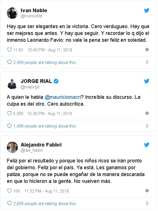 Ya presentado el escrutinio provisorio, famosos e intelectuales no dejaron pasar la oportunidad de aportar u visión de los resultados que arrojaron las elecciones primarias. Te compartimos algunos comentarios: