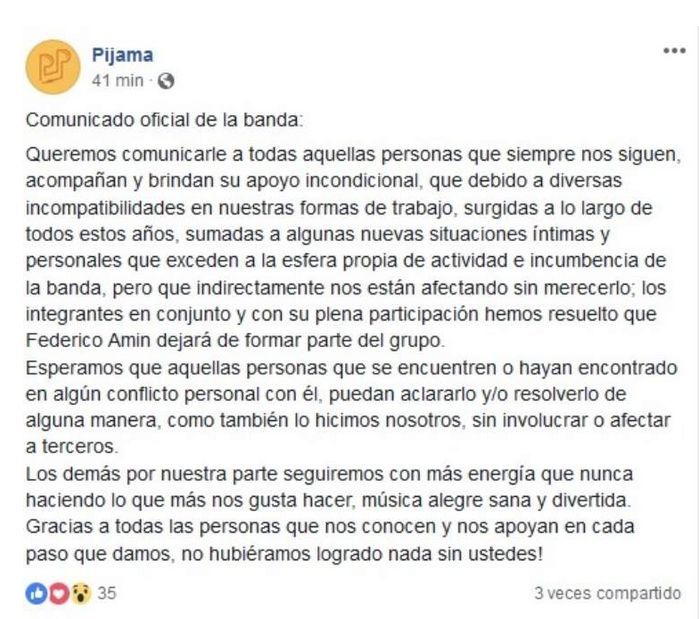 Convertido en un escándalo mayúsculo, con gran repercusión en medios y redes sociales, ayer fue la banda la que salió a despegarse: a través de un escueto comunicado, informó la desvinculación de Amín de Pijama Party, aduciendo "incompatibilidades en nuestra forma de trabajo’, pero además mencionó "algunas nuevas situaciones íntimas y personales’ que exceden al grupo y que los afecta "sin merecerlo’; y añadió que por su parte seguirán su actividad "con más energía que nunca’.