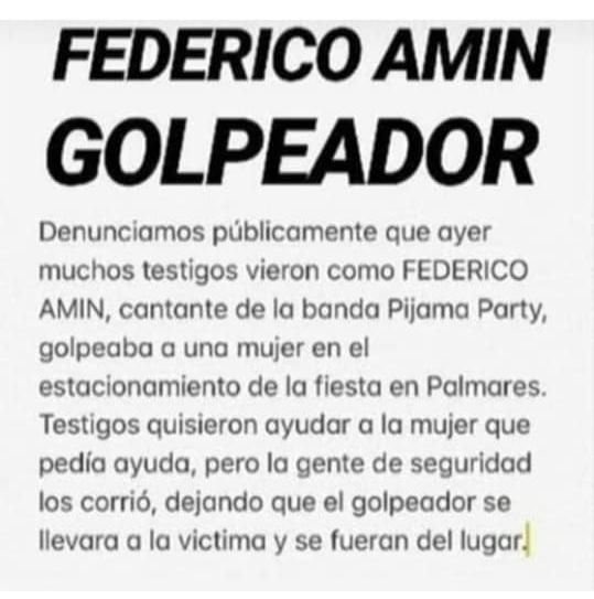 Así las cosas, en el lapso de unos pocos días, el conocido artista pasó a ser blanco de acusaciones por violento, con su nombre y fotos multiplicándose en las redes y una causa abierta; justo en el medio de un fuerte movimiento contra la violencia de género, que le da un marco aún más complejo al caso. Pero además, Amín se quedó sin su lugar en la banda de la que fue mentor y protagonista, donde se desempeñaba como cantante y guitarrista; que hasta llegó a tocar en el programa de Mirtha Legrand, entre otras vidrieras importantes dentro y fuera del país.