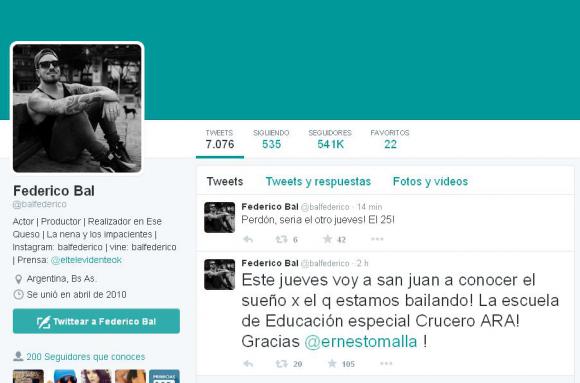"El jueves 25 de junio voy a estar por allá, muy contento" responde, amable, Federico Bal para confirmar a DIARIO DE CUYO lo que había anunciado por Twitter minutos antes. El hijo de Carmen Barbieri participa en el Bailando representando al sueño de la Escuela de Educación Especial ARA Crucero General Belgrano del departamento San Martín y vendrá a San Juan para visitar la escuela y tomar contacto con los alumnos. "Tengo muchas ganas de conocer a los chicos, a la escuela, San Juan es hermoso, muchas veces fui de gira con mi vieja, así que es un placer estar ahí" respondió el joven, que es acompañado en el certamen por Laurita Fernández y que el próximo martes tienen previsto volver a la pista con el street dance.