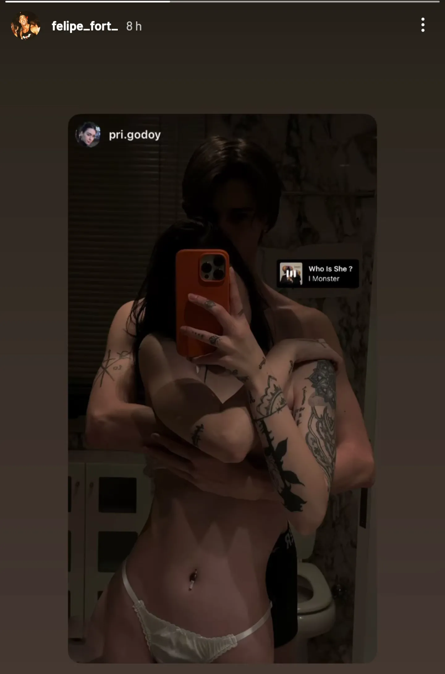 En la foto hot que subieron en las últimas horas, los jóvenes están muy apegados abrazándose en el baño, con sus torsos desnudos y luciendo sus tatuajes. El alto voltaje de la publicación demuestra la pasión que hay entre ambos y provocó el asombro en las redes sociales.