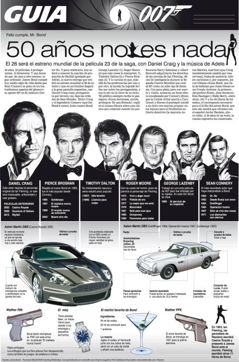 50 años. 23 películas. 6 protagonistas. 13 directores. Y una leyenda que -de cara a otro estreno- sigue ardiendo: James Bond cumple hoy medio siglo de vida, desde que Sean Connery se puso en los lustradísimos zapatos del glamoroso agente 007 en el Satánico Doctor No. Una completa infografía con la historia de este personaje.