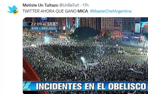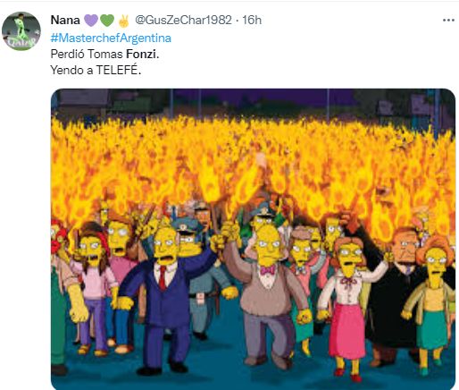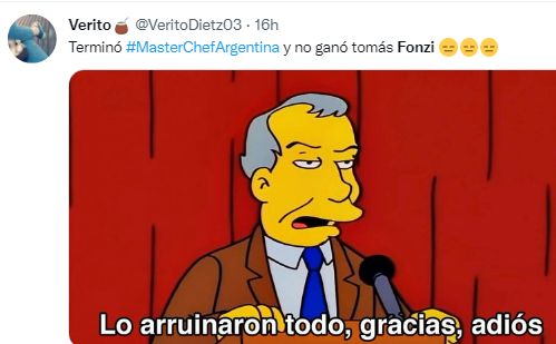 "Ya hay fuerte enojo en Twitter porque asegura que debería haber ganado Tomás Fonzi por una enorme evolución a lo largo del certamen. Muchas fonzistas están indignadas por esta definición", dijeron de un lado. "8 meses de embarazo y la piba no te la caretea un poco. Quiero ganar". Le puso picante a la competencia, que en fin era eso. "Feliz por Mica Viciconte", replicaban del otro. "Mica Viciconte es como ese alumno que te recita tal cual el manual. Tomás Fonzi el que logra darle otro vuelta de tuerca, el que crea respuestas interesantes, reflexivas, que te muestra que sabe, aunque no lo creas", saltó uno. "Era un programa de competencia de cocina, si no querían ver competencia vayan a ver el canal gurmet (dixit). Ganó quien jugó bien, se preparo y fue funcional reality. Genia" reaccionó otro… Fueron apenas algunos de los fuegos que ardieron en los escenarios virtuales tras el veredicto del programa conducido por Santiago del Moro, que -como era de esperar- incluyó ingeniosos y divertidos memes.