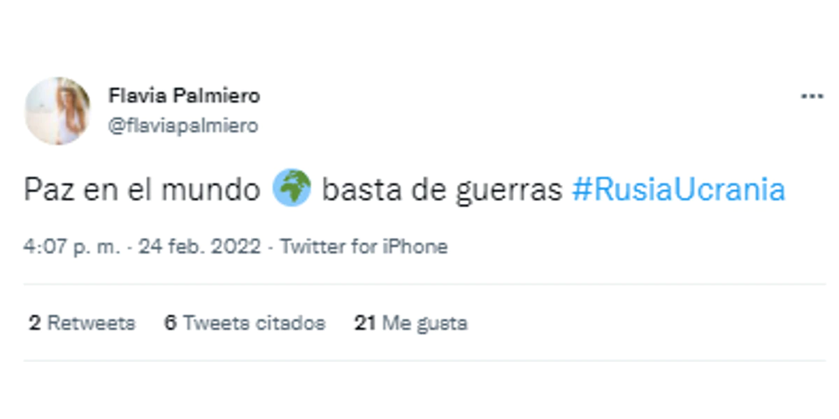Minutos más tarde de eliminar el comentario, Palmiero compartió uno nuevo donde escribió: “Paz en el mundo. Basta de guerras”, acompañado del hashtag #RusiaUcrania, expresándose a favor del fin del conflicto que está costando cientos de vidas.