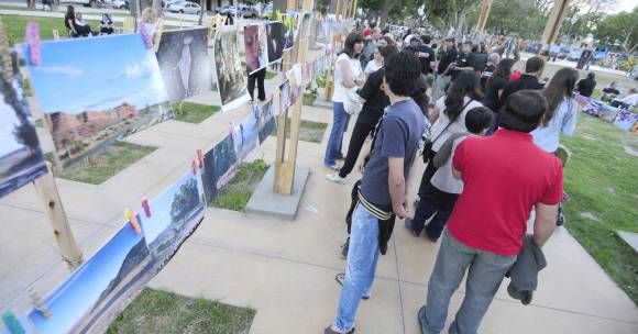 Un calmo atardecer primaveral fue el marco ideal para La colgada, la primera muestra de este tipo que en San Juan organizó el grupo Fotógrafos Amateurs San Juan ayer. La iniciativa de Leandro López, fundador del grupo, prendió bien entre sus compañeros y más de una veintena de miembros se dieron cita en la Plaza Hipólito Yrigoyen para exponer sus cinco mejores tomas. Como la consigna era colgar las fotografías, colocaron dos líneas de tanza de cada lado de la glorieta en el sector de los Viñateros, de las que los expositores suspendieron sus fotos. El otro detalle era usar broches de madera que algunos hijos de integrantes del grupo se animaron a pintar de colores. El resultado fue una muestra diversa, (porque el tema era libre), con paisajes sanjuaninos, retratos, animales, objetos, capturados por el ojo de estos amantes de la fotografía, en una tarde diferente, donde las fotos quedaron expuestas hasta la noche para quienes las quisieran disfrutar.