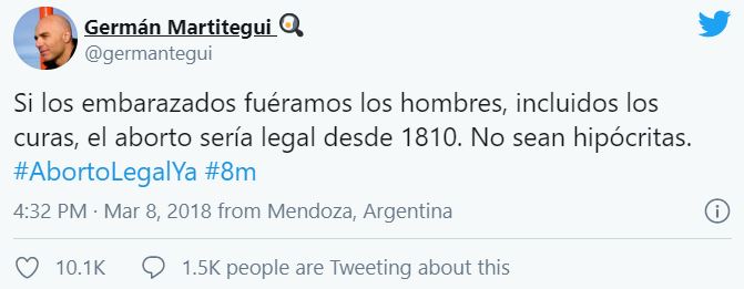 Ahora, Germán Martitegui retuiteó el mismo mensaje de hace más de dos años y agregó: “Este era de marzo de 2018 . Sigo pensando igual”. A su vez, sumó el hashtag #AbortoLegalEsVida y tres corazones verdes, que representan al color de los que poseen esta postura en favor a la legalización del aborto.