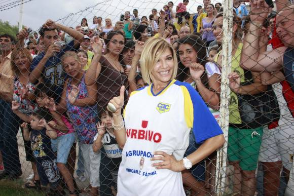 En el spot televisivo la pregunta es: "¿Qué estás dispuesto a hacer por amor?". Y en San Juan una mujer eligió que su marido pudiera despedirse del fútbol "a lo grande". Y así fue como el club Colón Junior fue el escenario para la grabación de una de las historias de amor, que tendrá el nuevo ciclo de Telefe conducido Catherine Fulop. " ¡¡Hola, mi gente bella!!" saludó a la tribuna con su inconfundible acento venezolano la conductora, ayer en una tarde de calor abrazador, ella, sonriente, explicó a todos cómo sería la mecánica de la grabación. "Cuando él entre a la cancha yo no existo, sólo gritamos, Quiroga, Quiroga…", preparó a la hinchada Fulop. El protagonista fue el futbolista Cristian Quiroga, jugador de Atenas que acaba de retirarse (ver aparte) y por eso su mujer decidió contactar a la producción de programa para contar su historia. Ayer, mientras su marido creía que ella estaba en la pileta con su hijo Santino (4), Cintia Pavé recibía a hinchas, parientes y amigos que llegaron hasta el club Colón, donde Quiroga jugó muchos años, para compartir la sorpresa para el futbolista. Pero además valía la pena ver de cerca la carismática conductora, que no decepcionó, porque sonrió, sonrió y sonrió; se sacó fotos con todos los que lograron llegar cerca, incluso las autoridades de los clubes y firmó camisetas. "Mmm, no es taan linda" decía un antiguo miembro de la comisión directiva después de mirar de cerca a la ex actriz que, con un solero suelto logró ocultar sus curvas.
