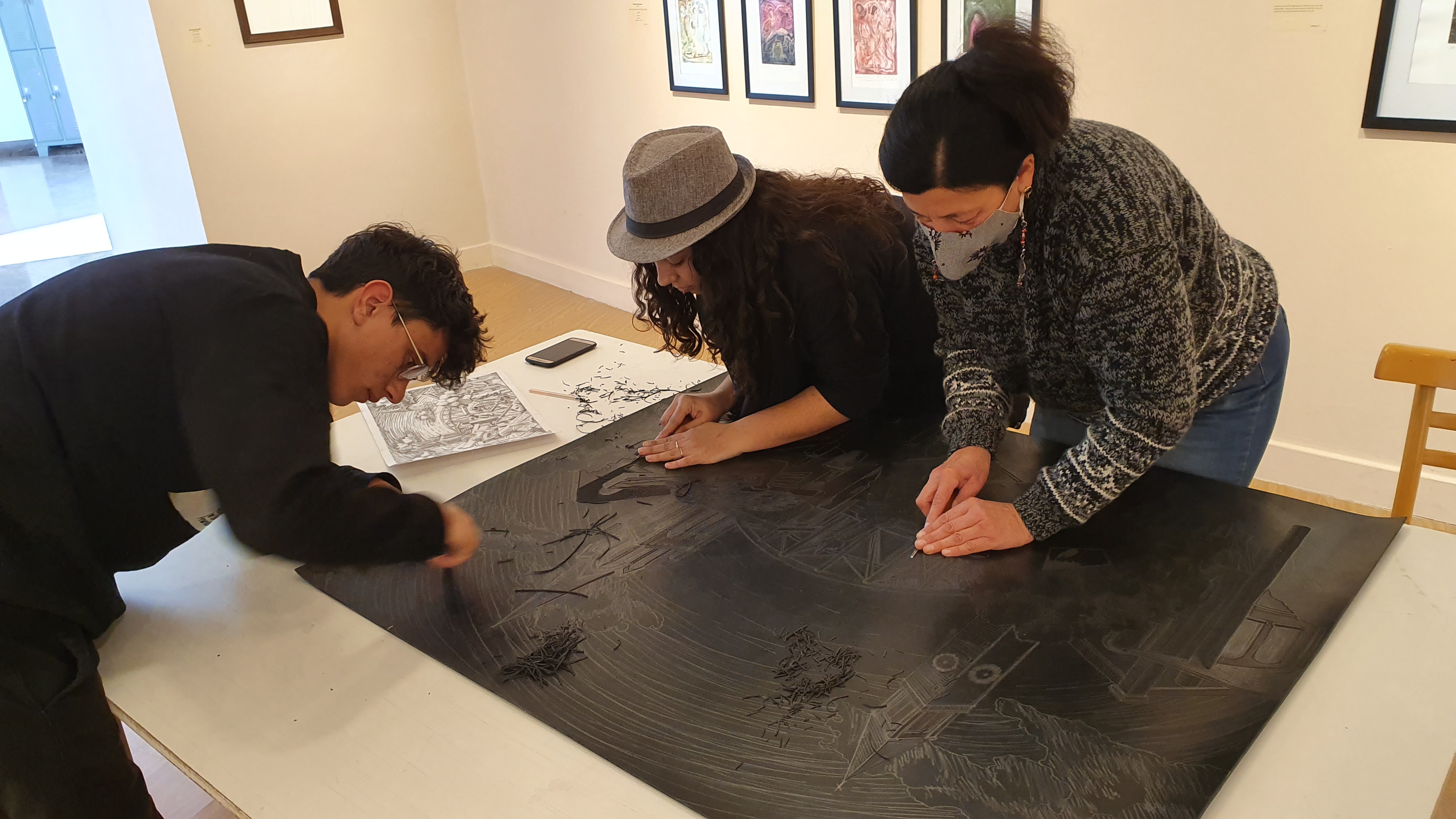 "Se trata de un verdadero reto para el grupo, que hasta ahora no había producido grabados en grandes formatos; y una experiencia original, por tratarse de una obra realizada en equipo", valoró Martínez, quien advirtió que si bien hay registro de acciones como estas en el país y el extranjero, no se había realizado acá un grabado de esas dimensiones y tampoco entre varias personas, "algo que no es sencillo porque una cosa es que quien diseñó el boceto lo talle y otra es que lo hagamos entre varios, que vamos rotando, adaptándonos a las directivas de quien lo creó".