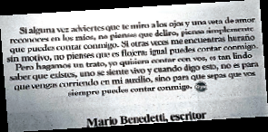 La obra poética del escritor uruguayo Mario Benedetti puede ser pensada a la manera de un inventario de memorias, sentimientos e imágenes que pugnan permanentemente contra el olvido, el desinterés y la desesperanza. Desde la libertad de quien no pretende más que escribir lo que siente, sus textos interpelan a los lectores a través de la inclusión de problemáticas sociales (la violencia de la Dictadura, el exilio, las crisis políticas y el desencanto generalizado) en diálogo con temas íntimos como el amor y la nostalgia.