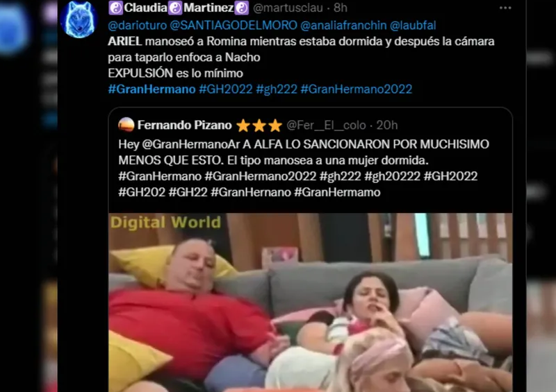 Las imágenes muestran a Romina acostada, dándole la espalda a Ariel, escuchando atentamente a Nacho. En ese entonces, el nuevo participante le da nalgadas a su compañera que no percibe el hecho, ya que no lo ve de frente. Pero es el joven de 19 años quien se alerta por la situación y le lanza una mirada letal a su compañero, quien deja de realizar la acción.