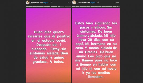 “Buenos días, quiero avisarles que di positivo en el estudio covid. Después del cuarto hisopado. Estoy sin síntomas aislada. Bien de salud y ánimo. Gracias. A todos”, escribió en sus historias de Instagram.