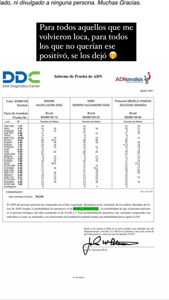 Es por eso que Ailén Díaz decidió hacer público el caso y su reclamo. En las últimas horas, dio a cononcer el resultado de ADN y pudo comprobar la filiación de su hijo Ramiro con el cantante fallecido.