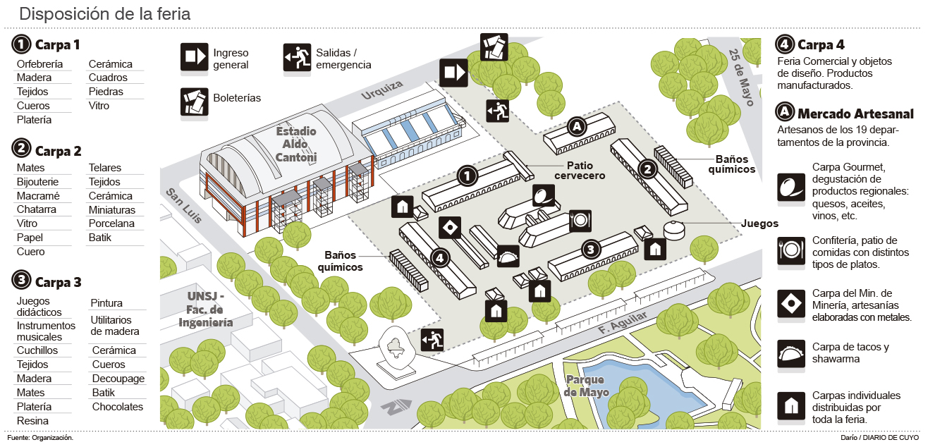 Tampoco faltará el Mercado Artesanal Tradicional Luisa Escudero, que depende del Ministerio de Turismo y Cultura. Los artesanos de los departamentos de la provincia tendrán también su lugar adecuado.