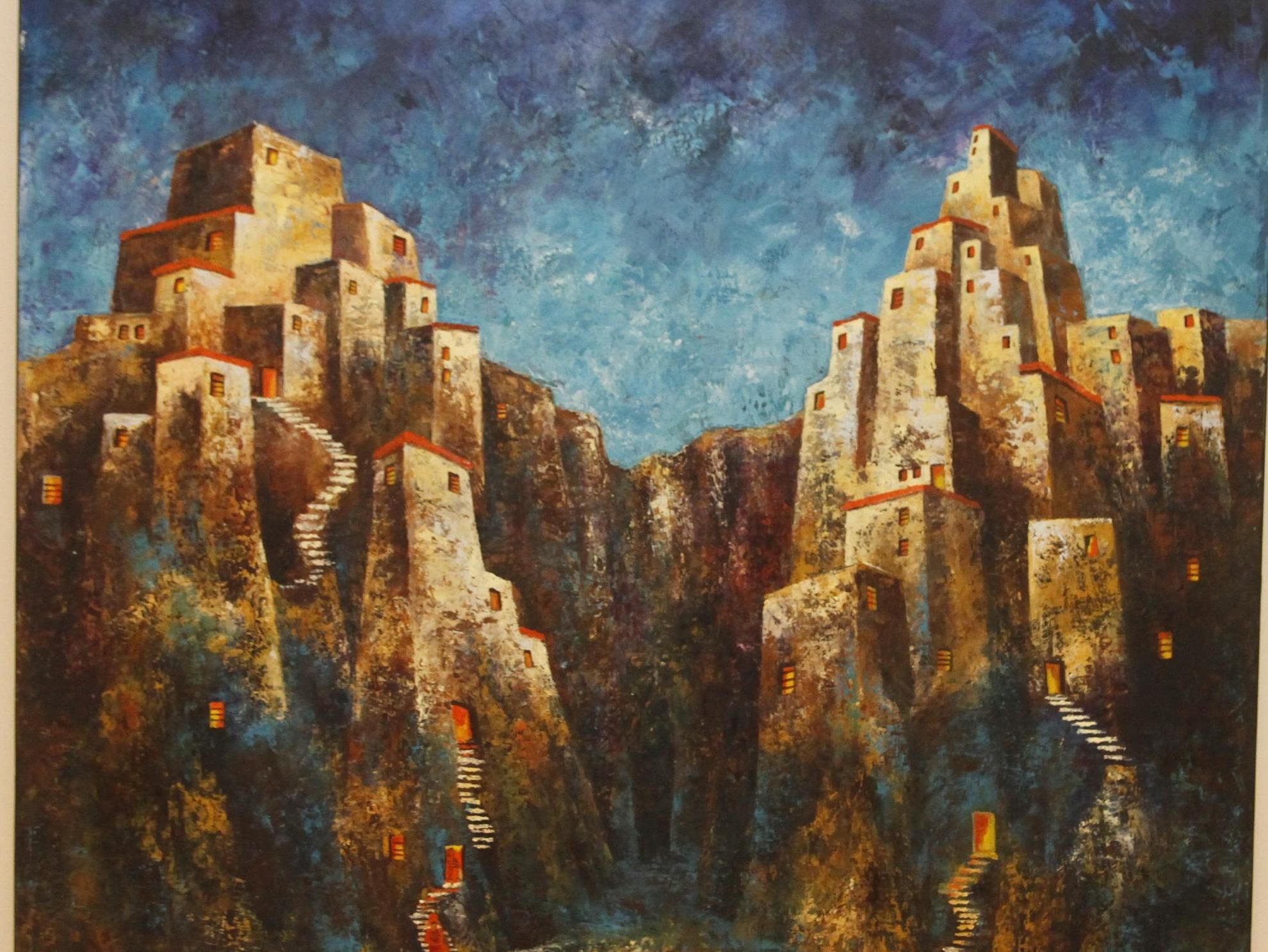 "Casas de miel", "Castillo", "Momentos de oración", un tríptico de la serie "Laberintos urbanos" y "Luz sobre la cornisa", son algunas de las piezas que conforman esta propuesta, visual y espiritual, que fue nutriéndose de otras anteriores. Ciudades y monasterios en precipicios, estructuras talladas de laderas de montaña, son representaciones inspiradas, además, en el estudio de la arquitectura hindú o en la de Capadocia, una antigua ciudad oriental que está situada dentro de una inmensa cueva.