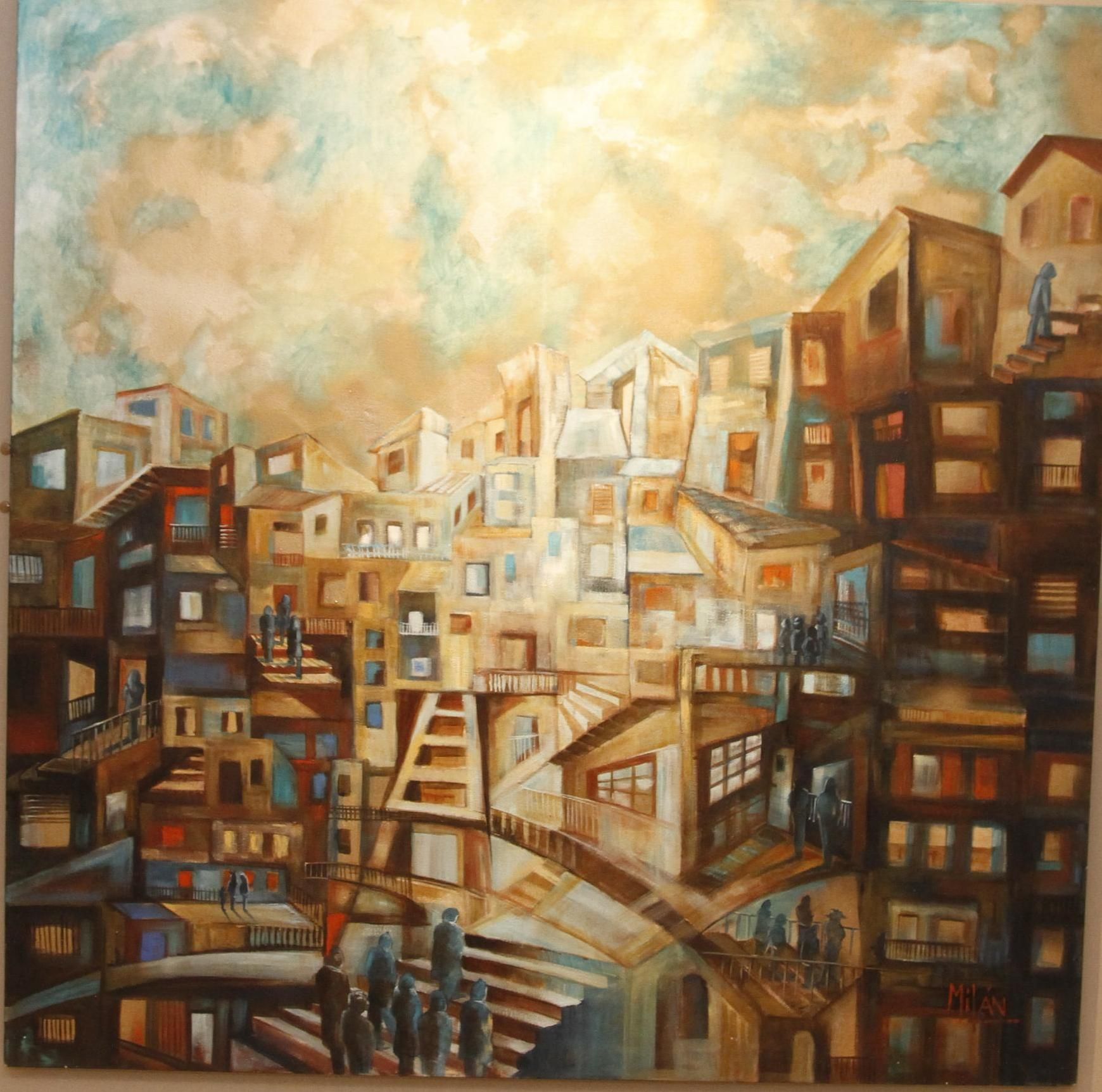 Después de haber mostrado la evolución de su producción en el Espacio de Arte de la Sociedad Israelita con "Camino recorrido" y participado con una de sus pinturas en la muestra 18 Mundos (Estación San Martín), la muralista y docente Estela Milán hará su última exposición individual del año, que a su vez será el cierre del ciclo anual de Galería Artify, consolidada como otro nexo valioso entre artistas y público. Se titula "Sostenidas por un muro" y es una serie de 18 piezas, variables en dimensiones y formatos, que muestran paisajes figurativos de muros, edificios, casas y castillos sobre acantilados y montañas. Pero no se trata de simples paisajes. Si se observa con más cuidado y detalle, entre pinceladas pueden verse diminutos personajes. La propuesta, en definitiva, lejos está de ser un conjunto de simples construcciones sobre rocas.