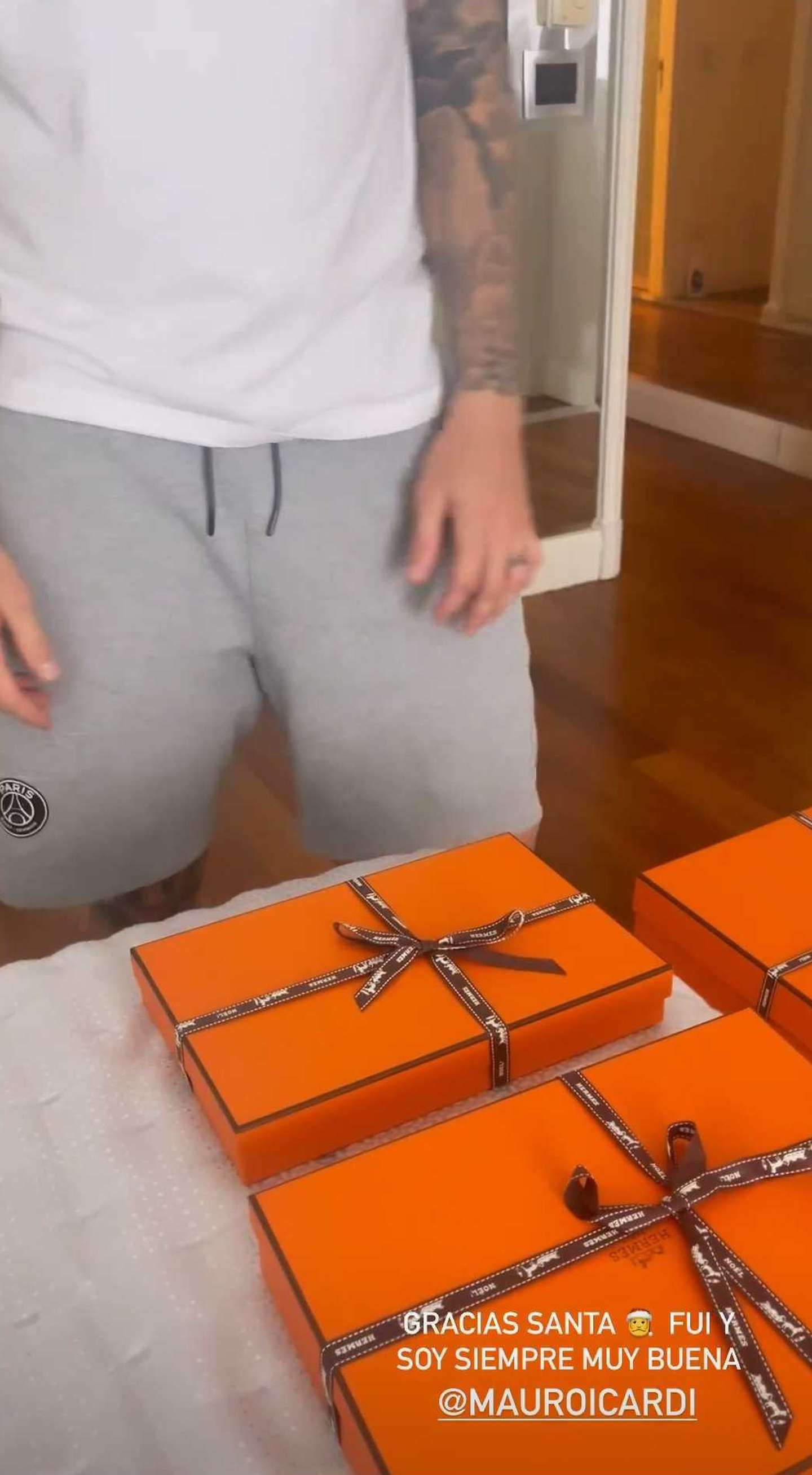 Mauro Icardi dejó varios regalos en el arbolito con el nombre de Wanda Nara, que luego del brindis de Navidad se acercó para saber qué eran. El futbolista la sorprendió con seis cajas de Hermès, su marca favorita.