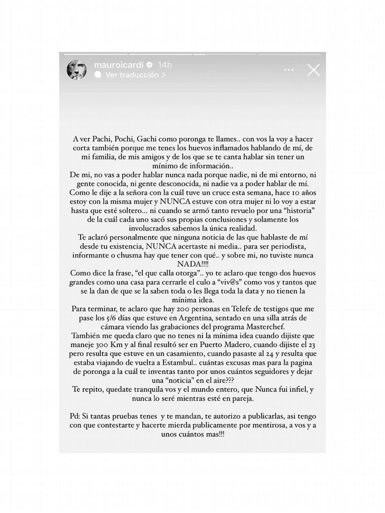 Icardi no tardó en realizar un descargo en sus historias de Instagram: “A ver Pachi, Pochi, Gachi, como poro… te llames. Con vos la voy a hacer corta también porque me tenés los huevos inflados hablando de mí, de mi familia, de mis amigos y de los que se te canta hablar sin tener un mínimo de información”, comenzó.