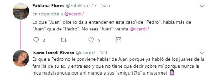 "Es que a Pedro no le conviene hablar de Juan porque ya habló de los juanes de la familia de su ex, y entre eso y que no tiene qué decir sobre mí porque nunca le hice nada (aunque por ahí manda a sus ‘amiguit@s’ a matarme)", contestó la ex Gran Hermano.