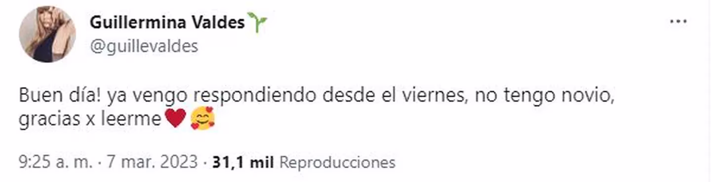 El martes pasado, Guillermina Valdes rompió el silencio luego de ser vinculada con Javier García, el arquero de Boca Juniors. Al ser abordada por un cronista de Intrusos (América), la actriz explicó que no estaba en pareja con el futbolista.